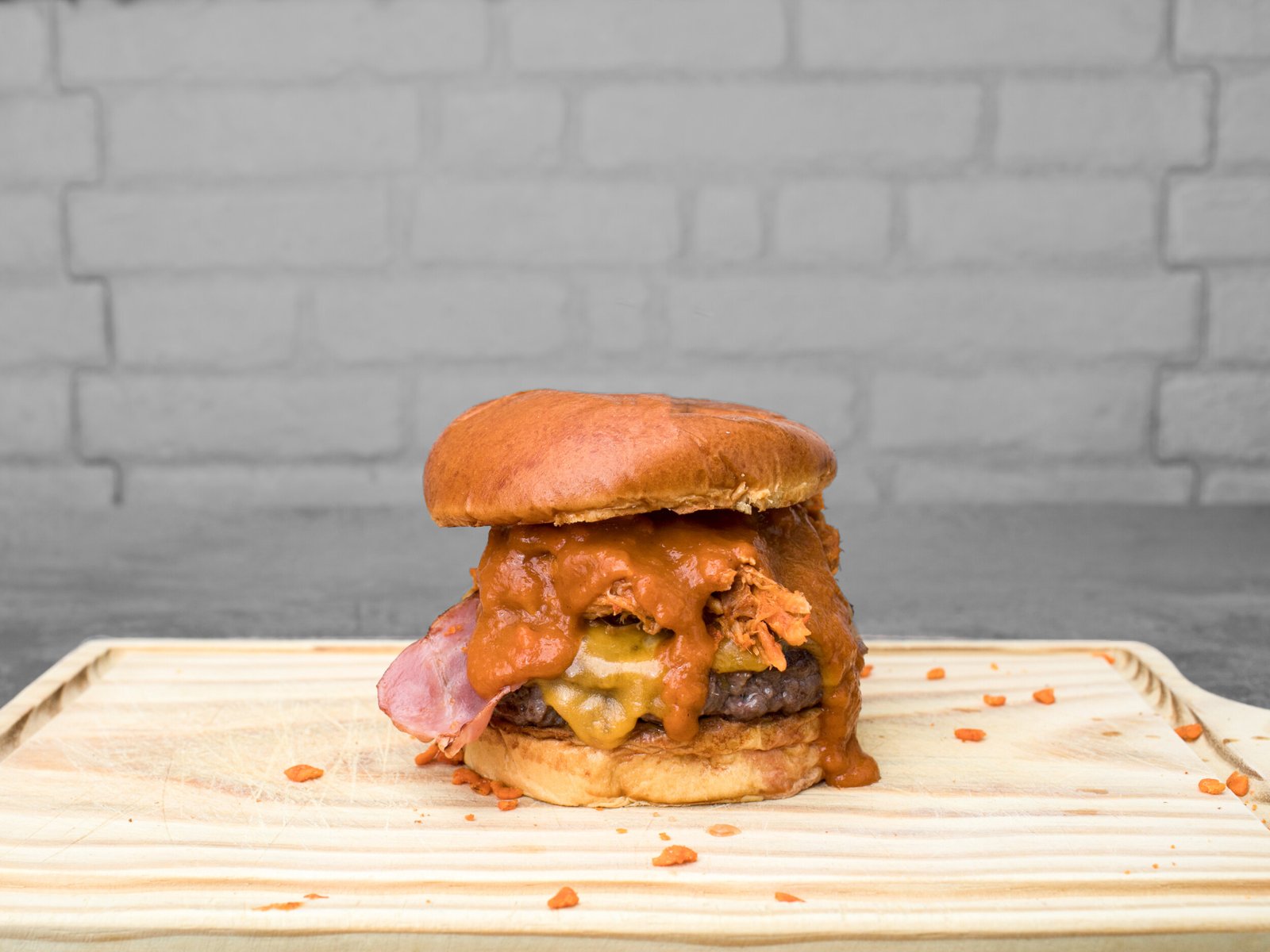 Chuletón deshuesado de ternera y tiras de asado, queso cheddar, pulled pork, mermelada de bacon, doritos Bits y salsa BBQ Jack Daniels casera, sobre pan brioche de patata. Aprox. 200 gr.