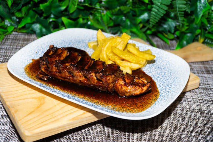 Costilla deshuesada cocinada a baja temperatura con salsa artesana de soja, miel y limón, acompañado de patatas.